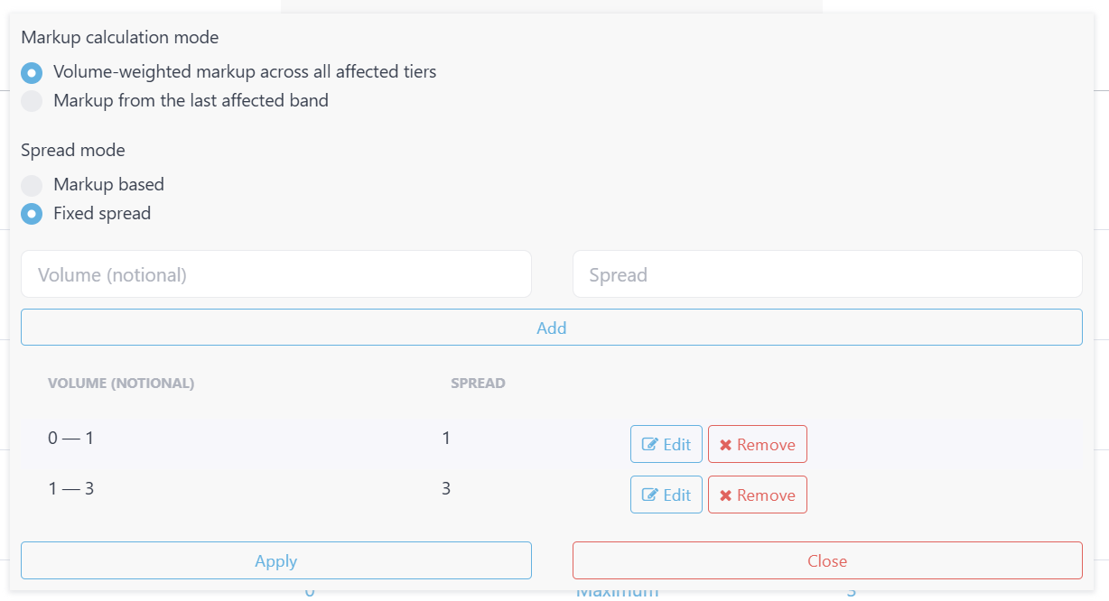 - We have introduced the ability to set spread values for Volume-Based Markup parameters in FIX session set profiles.