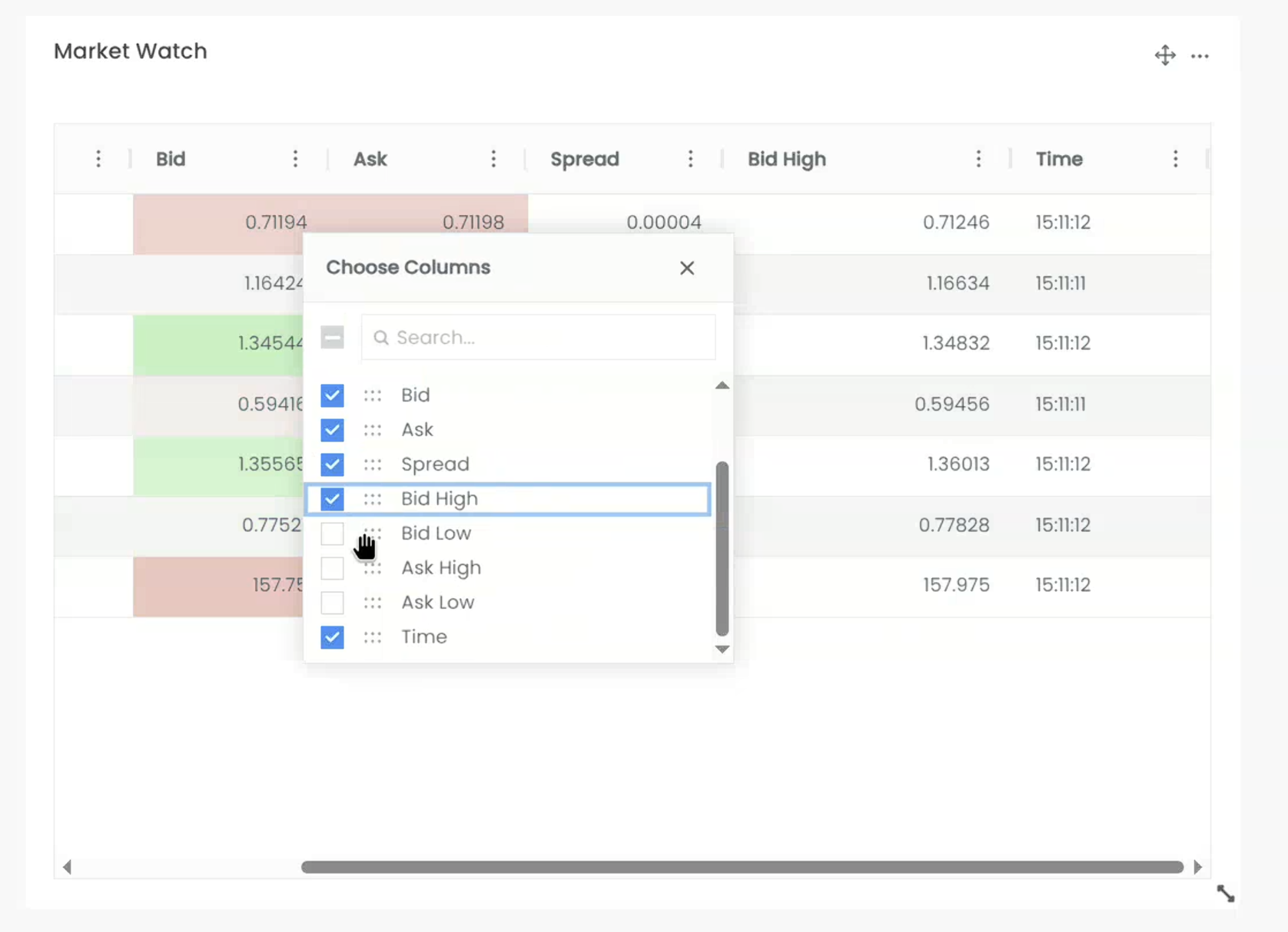 - We have included the Bid/Ask Low and High columns in the Market Watch widget for the current day.
