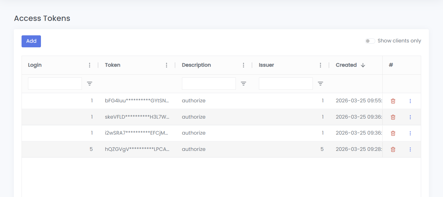 We've added a new page, Access Tokens, where you can view and manage all access tokens for all accounts. Access tokens allow you to make API calls to Admin or Public APIs with the option to set a custom expiration time.